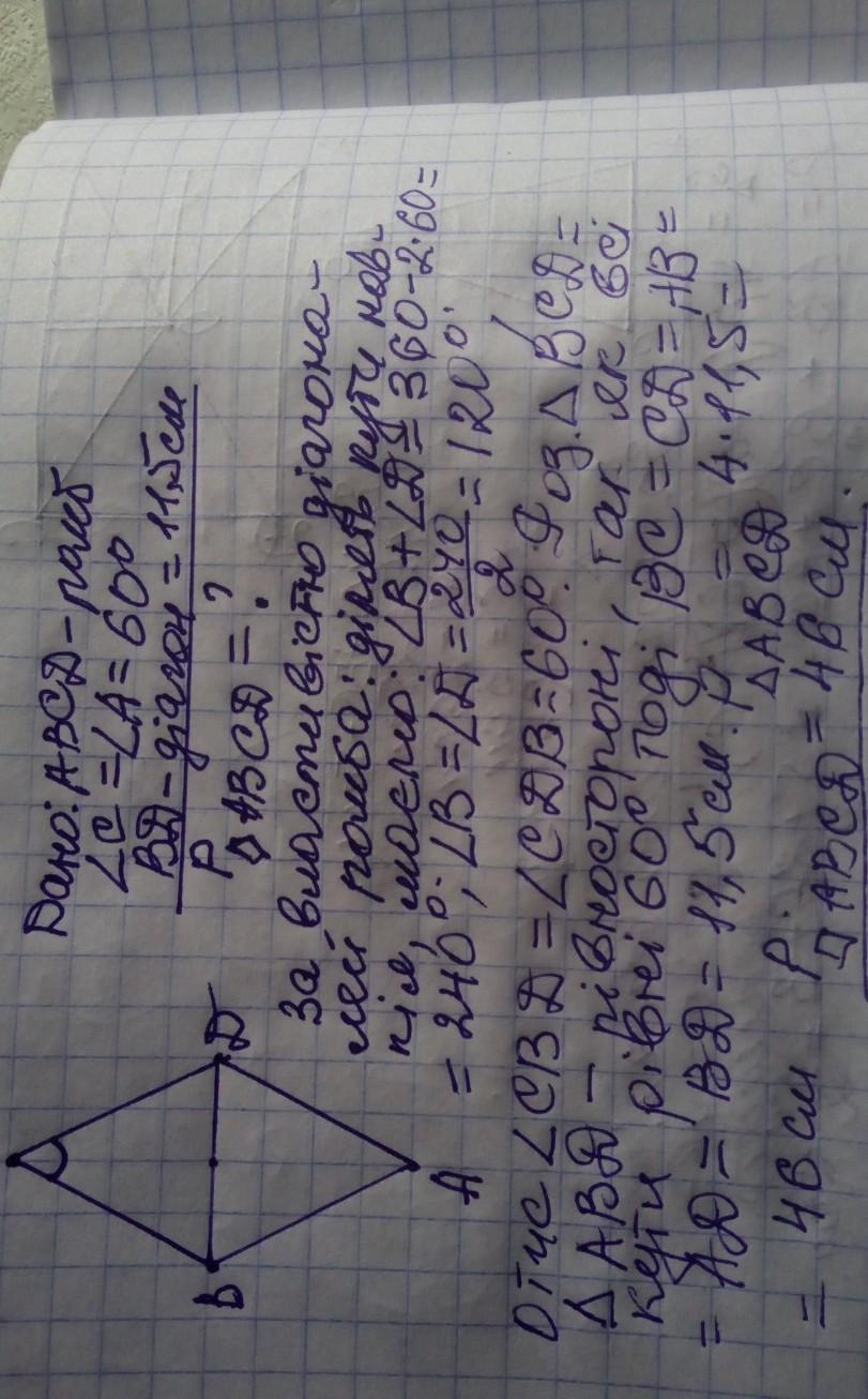 Знайти периметр ромба, якщо його гострий кут дорівнює 60º, а діагональ, яка з'єднує вершини тупих кутів, дорівнює 11,5см.