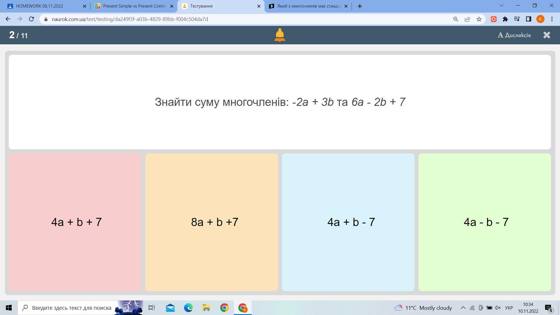 (-2a + 3b)+(6a - 2b + 7)=-2a + 3b + 6a - 2b + 7=(-2a+6a)+(3b-2b)+7=4a+b+7.