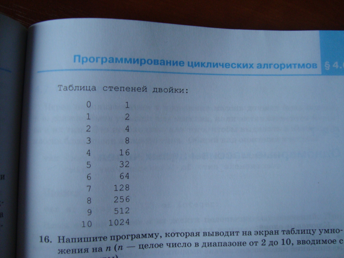 Напишите программу на языке паскаль, которая выводит на экран таблицу степеней двойки(от нулевой до десятой). Рекомендуемый вид экрана после выполнения программы представлен ниже: