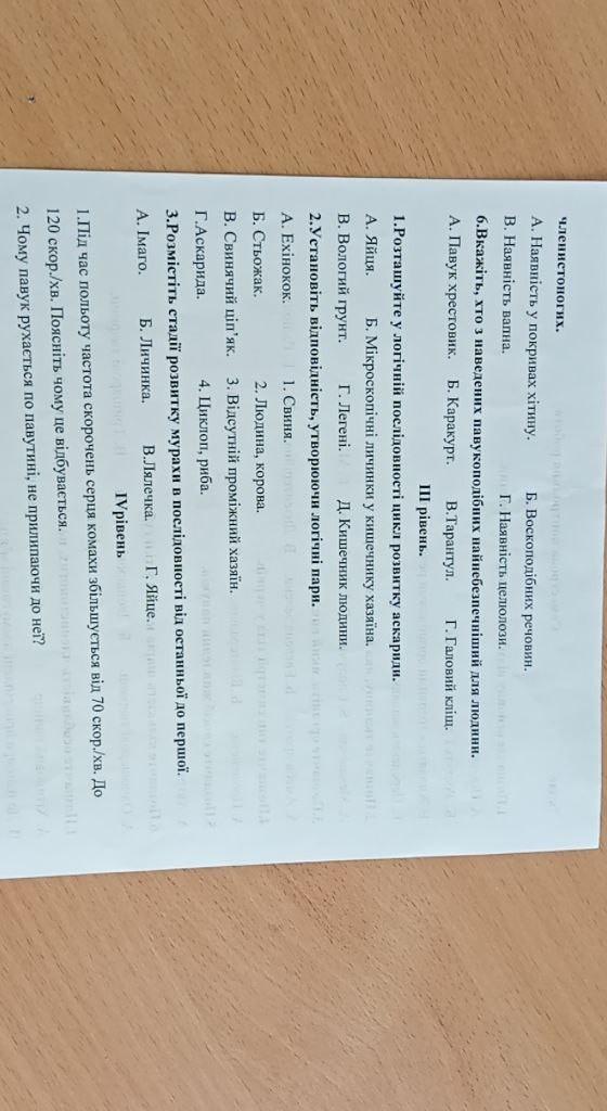 від 1.Позначте основну відмінність тварин рослин. А. Пiд час дихання поглинають кисень. Б..Ростуть і розмножуються. В.Живляться готовими органiчними речовинами. Г. Передають нащадкам характерні для людини. 2.Позначте тканину, яка відсутня у тварин. Г. М'язова. А. Механічна. Б. Сполучна. В. Епітеліальна. 3.Позначте органiзм, який викликає захворювання у людини. А. Амеба протей. Б. Евглена зелена. В. Дизентерiйна амеба. 4.Позначте тип симетрiï тіла у червів. А. Променева. Б. Бiлатеральна. 5.Позначте спосіб живлення павуків. В. Асиметричні тварини. Г. Радіолярій. А. Автотрофи. Б. Хижаки. В. Паразити. 6.Позначте кiлькiсть шарiв клітин у тiлi губок. А. Одношарові тварини. Б. Двошарові тварини. В. Тришарові тварини. П рiвень 1.Позначте особливість членистоногих, не властиву ракоподібним. Б. Розвиток прямий. А. Хітиновий панцир. В. До панцира прикріплені посмуговані м'язи. Г. Тіло розділене на голову, груди, черевце. 5. Відшукайте місце, де відбувається статеве розмноження малярiйного плазмодія. А. У клітинах печінки людини. Б. В еритроцитах людини. В. В організмі самки малярійного комара. Г. У зовнішньому середовищі (у водоймах). 3.Позначте особливість не властиву плоским червам. А. Тришарові. В. Є паренхіма. Б. Дифузна нервова система. Г. Органи виділення-метанефридії. 4. Відшукайте, де відбувається остаточне перетворення їжі у гідрн. А. У кишковій порожнині. Б. У тонкому кишечнику. В. Поза організмом. г. у вакуолях травних клітин. 5.Вкажіть пристосування, яке зменшує випаровування через покриви у наземних
