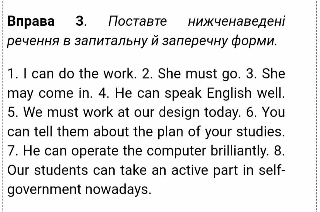 Помогите пожалуйста!я не понимаю как делать эту вправу 1,3,5,7 речення треба робити в питальній формі а 2,4,6,8 в заперечній формі