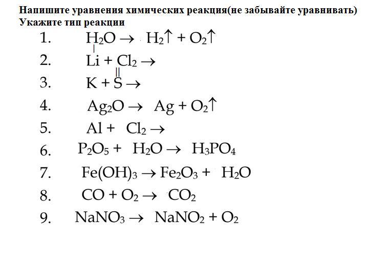 Записать буквенную схему реакций соединения и разложения. А+В = АВ -соединение, АВ=А +В - разложение 3. Записать уравнения, расставить коэффициенты, указать тип реакции.