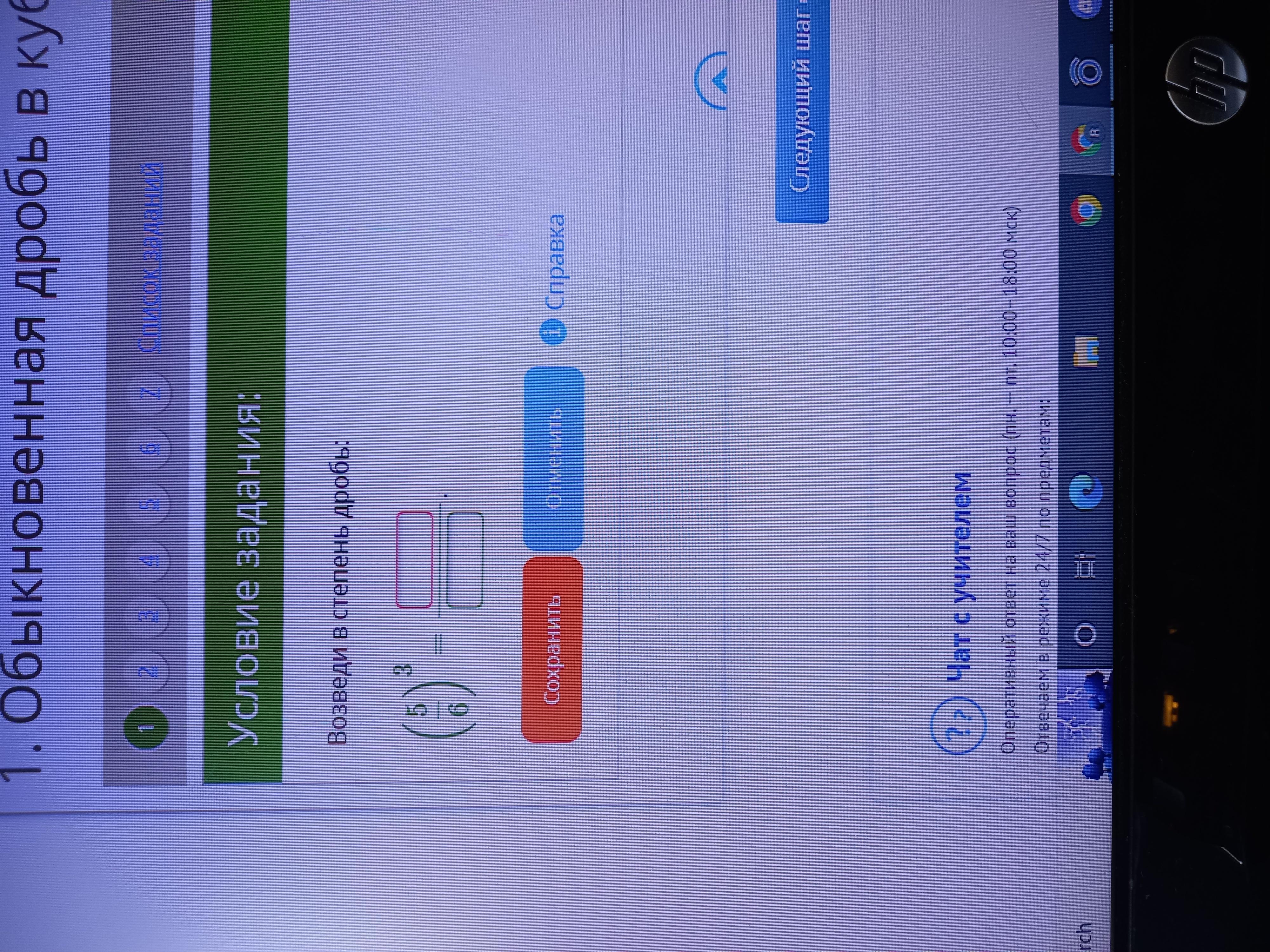 Пошаговое объяснение: (5/6)^3=5^3/6^3=125/216