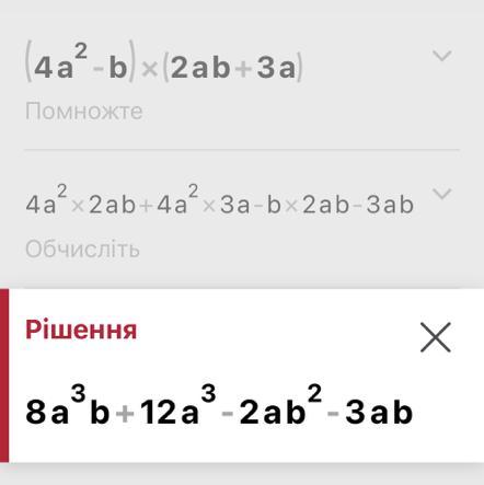2) (4a²-b)(2ab + 3a). виконайте множення многочленів