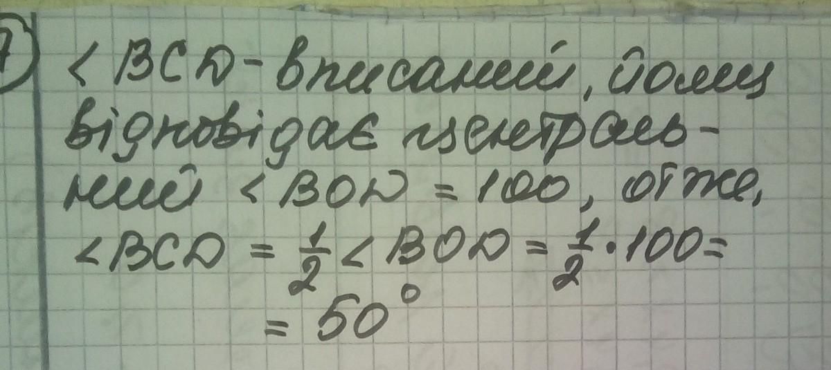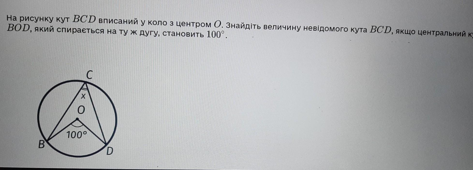 На рисунку кут BCD вписаний у коло з центром О. Знайдіть величину невідомого кута BCD, якщо центральни