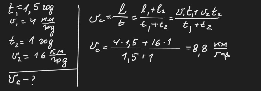 Пішохід 1,5 год йшов зі швидкістю 4 км/год, а потім 1 год їхав на велосипеді зі швидкістю 16 км/год. Яка середня швидкість на всьому шляху?