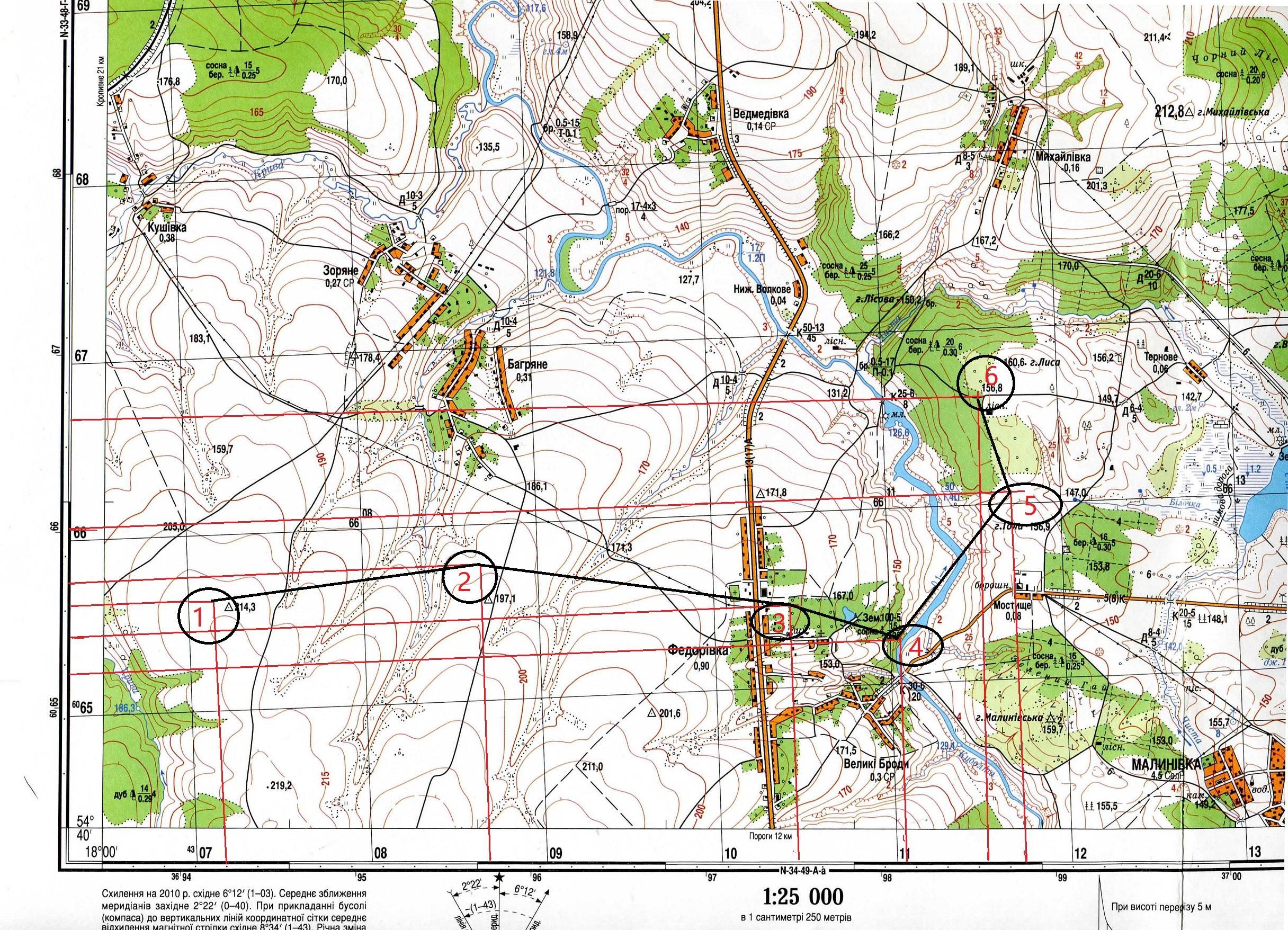 - Маршрут по точках, за наданими координатами, на топографічній карті дан нижче у додатку