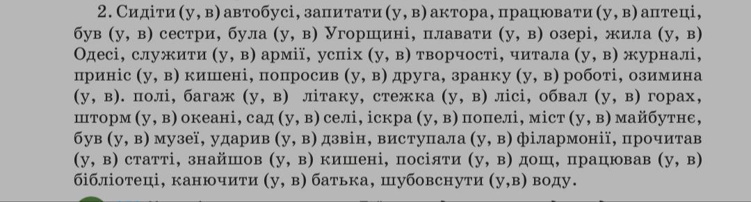 Сидіти в автобусі, запитати у актора, працювати в аптеці, був у сестри, була в Угорщині, плавати в озері, жила в Одесі, служити в армії, успіх у творчості, читала в журналі, приніс в кишені, попросив у друга, зранку у роботі, озимина в полі, багаж у літаку, стежка в лісі, обвал у горах, шторм в океані, сад у селі, іскра в попелі, міст у майбутнє, був у музеї, ударив у дзвін, виступала у філармонії, прочитав у статті, знайшов у кишені, посіяти в дощ, працював у бібліотеці, канючити у батька, шубовснути у воду,