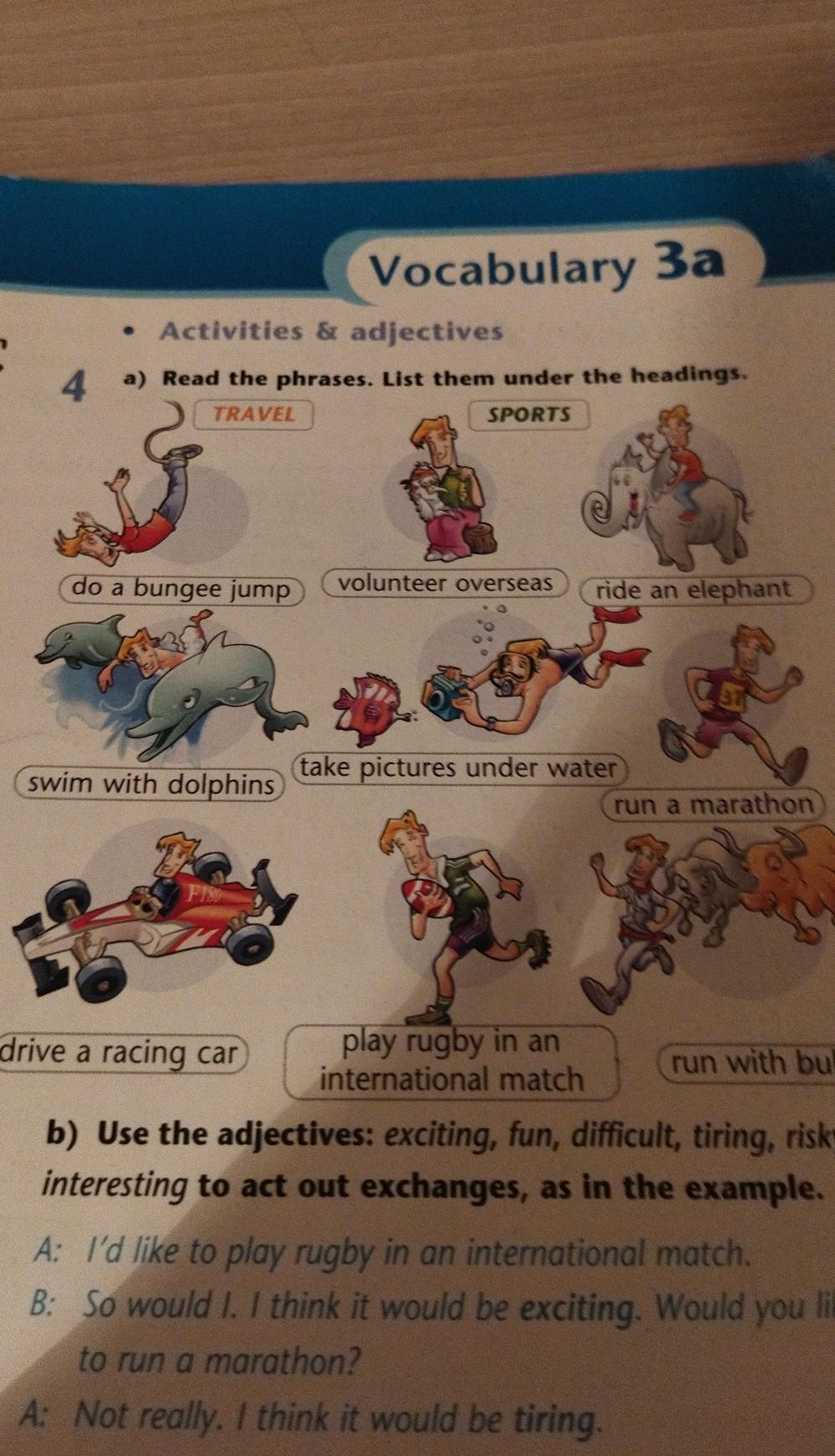 4 a) Read the phrases. List them under the headings. TRAVEL SPORTS do a bungee jump swim with dolphins volunteer overseas ride an elephant take pictures under water play rugby in an international match run a marathon drive a racing car run with bulls b) Use the adjectives: exciting, fun, difficult, tiring, risky, interesting to act out exchanges, as in the example. A: I'd like to play rugby in an international match. B: So would I. I think it would be exciting. Would you like to run a marathon? A: Not really. I think it would be tiring.
