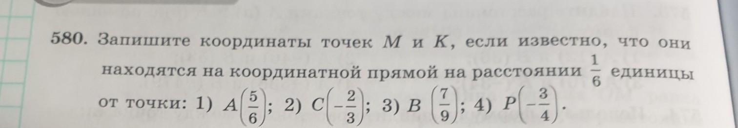 580. Запишите координаты точек М и К, если известно, что они 2 7 3 находятся на координатной прямой на расстоянии 2) C(-3); 3) в ; 4) Р 9 5 4 6 той изображены точки А от точки: 1) А 1 6 единицы