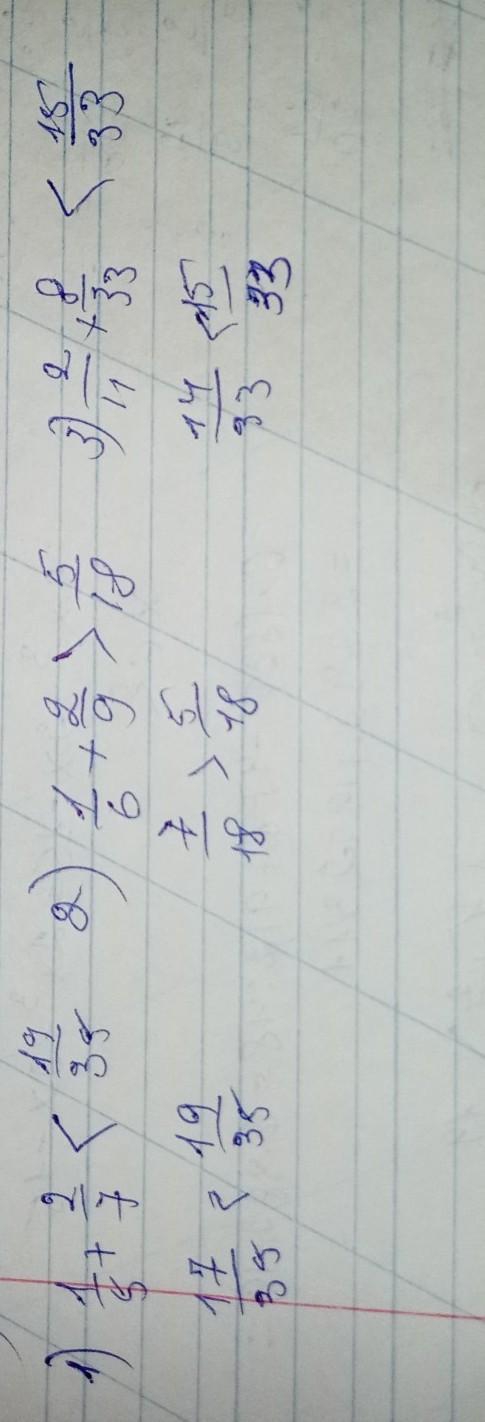 порівняйте: 1) 1/5+2/7 і 19/35; 2)1/6+2/9 і 5/18 3)2/11+8/33 і 15/33