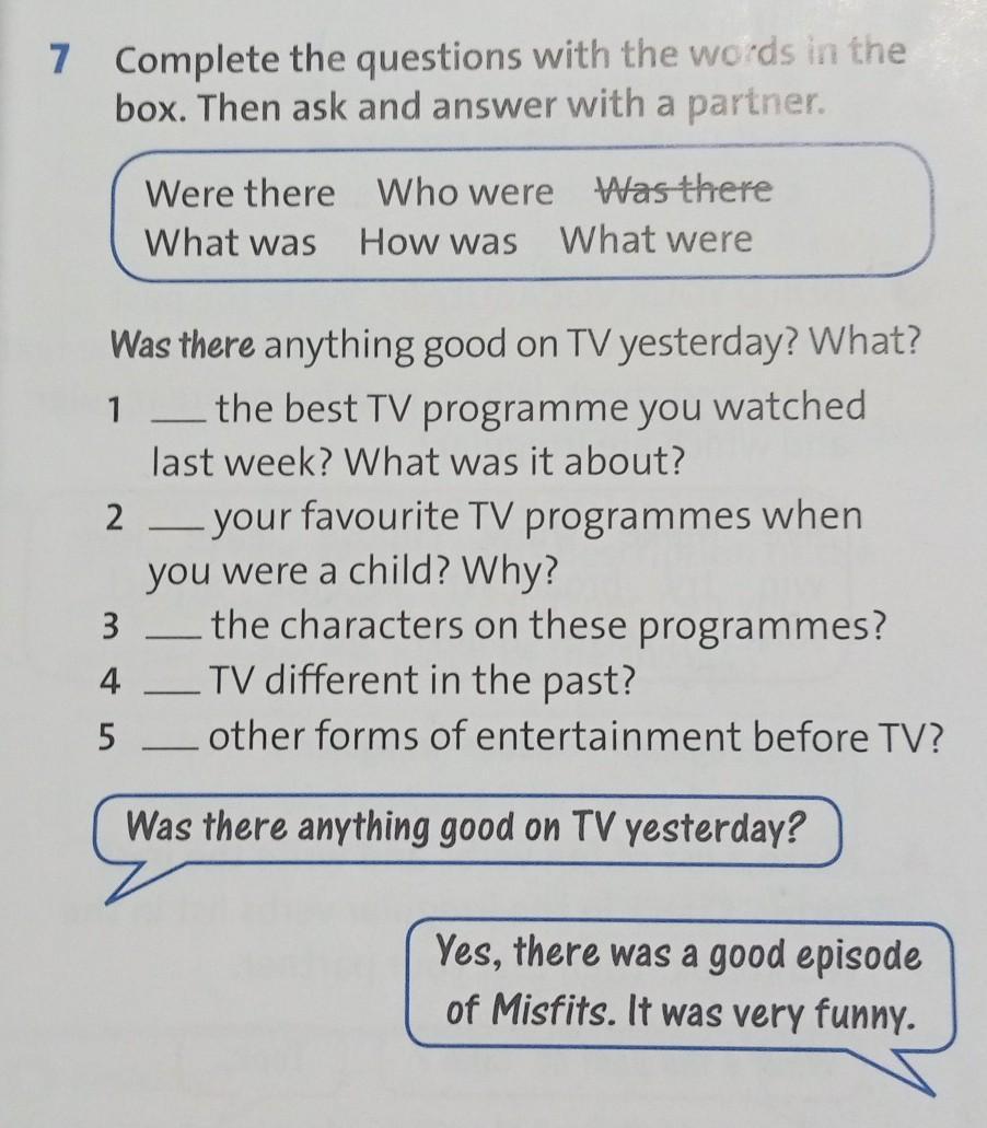 7 Complete the questions with the words in the box. Then ask and answer with a partner. Were there Who were Was there What was How was What were Was there anything good on TV yesterday? What?