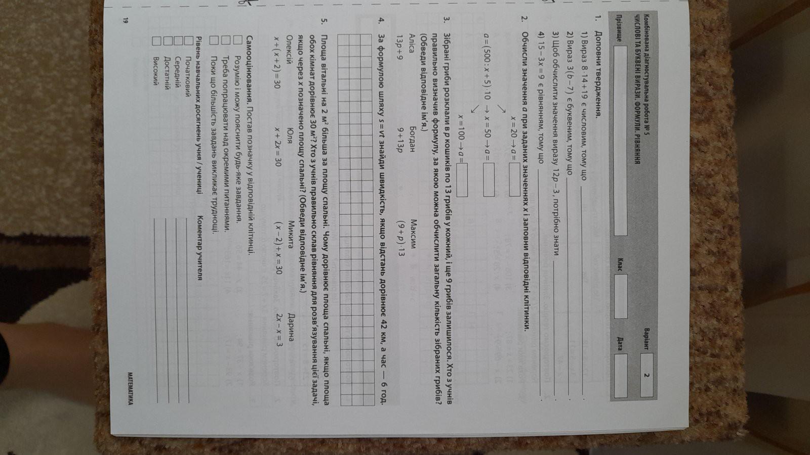 Доповни твердження. 1) Вираз 8-14+19 € числовим, тому що 2) Вираз 3(b-7) є буквеним, тому що 3) Щоб обчислити значення виразу 12р-3, потрібно знати 4) 15-3x=9 € рiвнянням, тому що плас да а