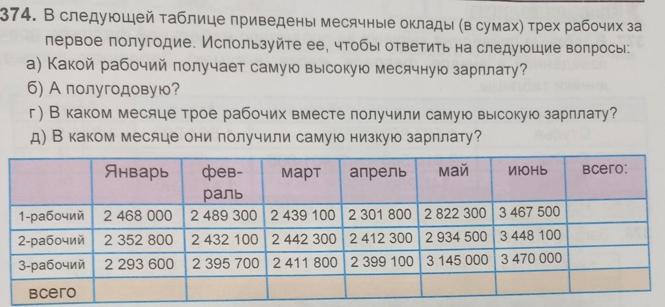 374. В следующей таблице приведены месячные оклады (в сумах) трех рабочих за первое полугодие. Используйте ее, чтобы ответить на следующие вопросы: а) Какой рабочий получает самую высокую месячную зарплату? б) А полугодовую? г) в каком месяце трое рабочих вместе получили самую высокую зарплату? д) В каком месяце они получили самую низкую зарплату? Январь март апрель май фев- раль 1-pабочий 2 468 000 2 489 300 2 439 100 2-pабчий 2 352 800 2 432 100 2 442 300 3-рабочий 2 293 600 2 395 700 2 411 800 всего 2 301 800 2 412 300 2 399 100 2 822 300 2 934 500 3 145 000 ИЮНЬ 3 467 500 3 448 100 3 470 000 всего: