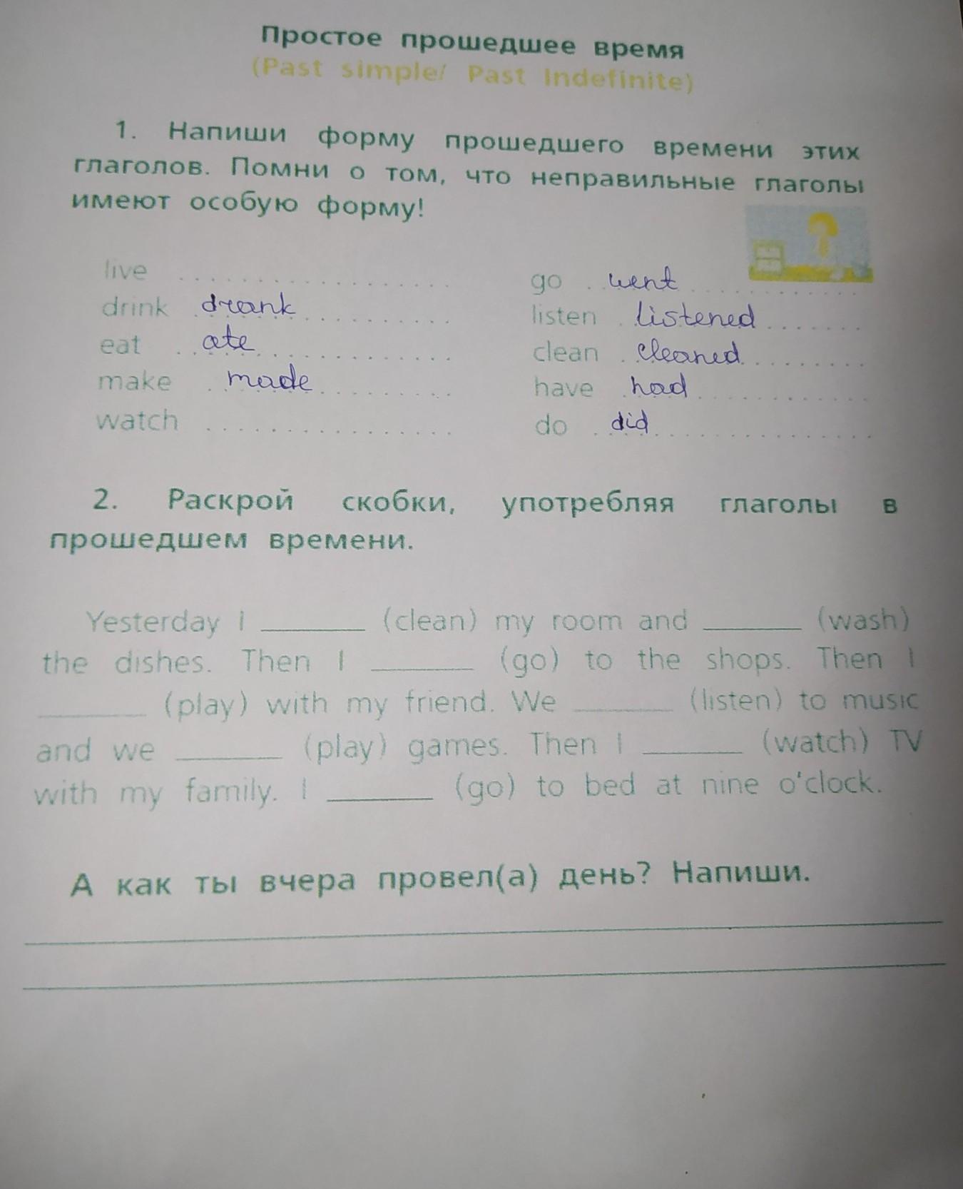 2. Раскрой скобки, употребляя прошедшем времени. Yesterday I the dishes. Then I (clean) my room and глаголы (wash) (go) to the shops. Then I (listen) to music and we (play) games. Then I (watch) TV with my family. I ______ (go) to bed at nine o'clock. А как ты вчера провел(а) день? Напиши.