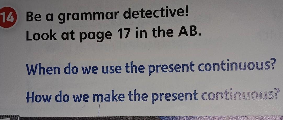 14 Be a grammar detective! Look at page 17 in the AB. When do we use the present continuous? How do we make the present continuous?