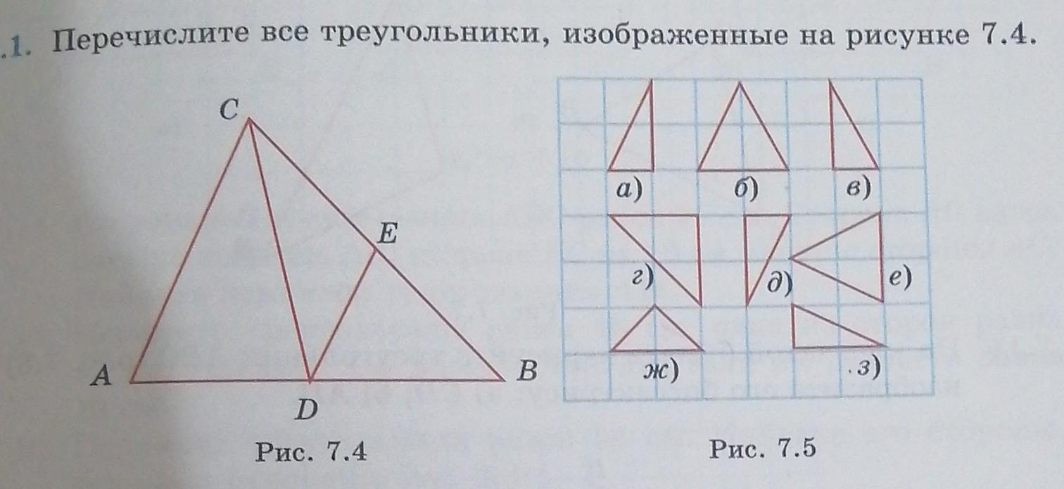 7.1. Перечислите все треугольники, изображенные на рисунке 7.4. ДА a) б) A D Рис. 7.4 А E В СО 2 ж) д) Рис. 7.5 в) .3) e)