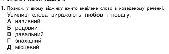 1. Познач, у якому відмінку вжито видiлене слово в наведеному реченні. Увічливі слова виражають любов і повагу. А називний Б родовий В давальний Г знахідний Д Місцевий