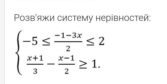 Розв'яжи систему нерівностей: -5 ≤-1-3x ≤ 2 2 x-1 21. 2 x+1 3 ПОМОГИТЕ ПРЯМ СЕЙЧАС СРОЧНО НУЖНО ,ПРОШУ !!!!!!!!!!!!!!