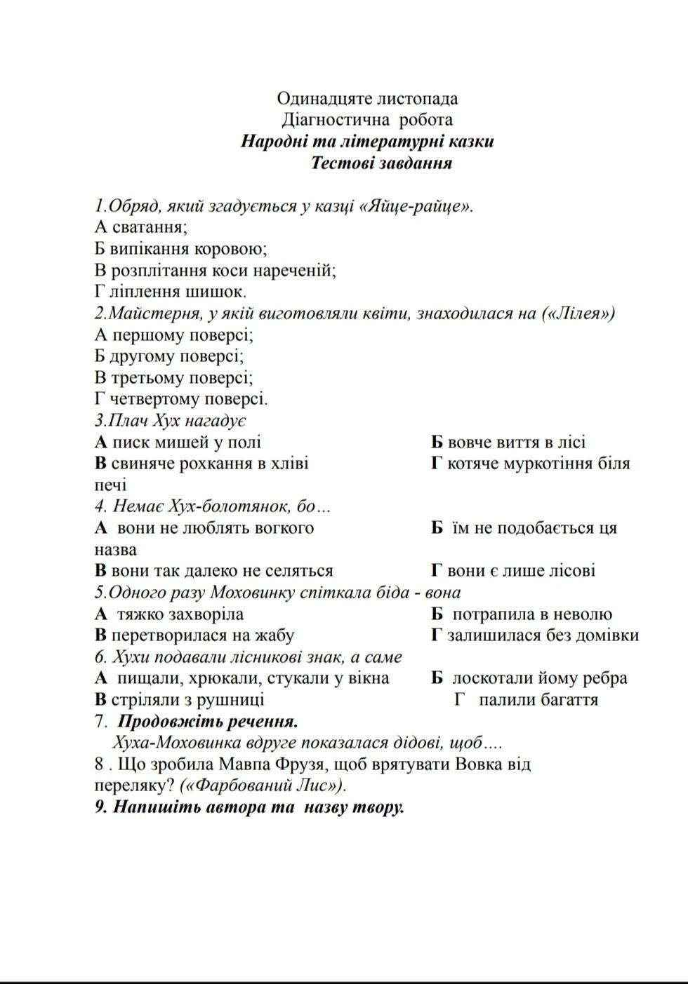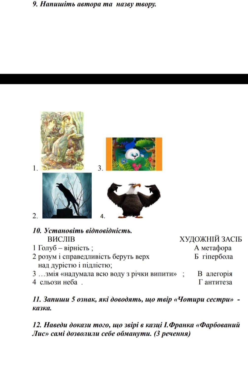 1.г 2.в 3.в 4.в 5.а 6.а 7.попросити помічі 8.обняла його 9. Іван Франко «Муховинка» 10. 1-а : 2-б :3-г : 4-в 11. Видумані персонажі, не реалістичні події, вимишлені ситуації, малюнки...