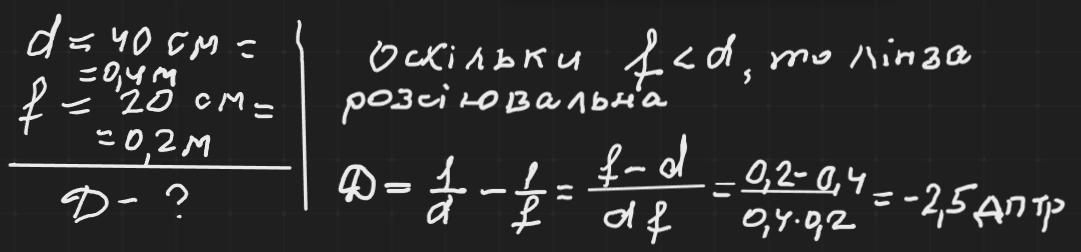 відстань від лінзи до предмета =40см,а до уявного зображення цього предмета 20 см, якаце лінза,що збирає чи розсіює .знайдіть її оптичну силу