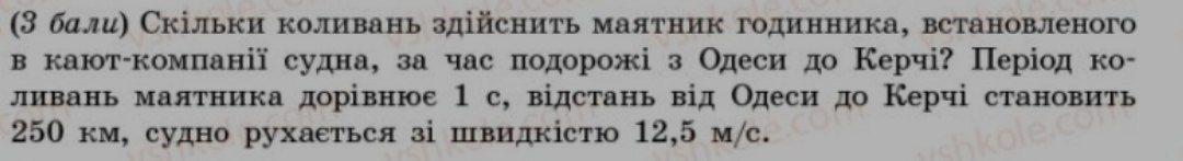 Скільки коливань здiйснить маятник годинника , встановленого кают - компанії судна , за час подорожі з Одеси до Керчі ? Перiод ко ливань маятника дорівнює 1 с , відстань від Одеси до Керчі становить 250 км , судно рухається зі швидкістю 12,5 м / с .