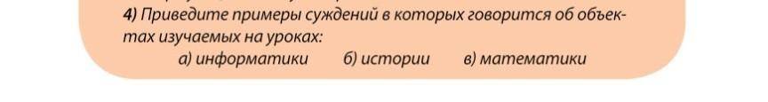 4) Приведите примеры суждений в которых говорится об объектах изучаемых на уроках: б)истории в)математики
