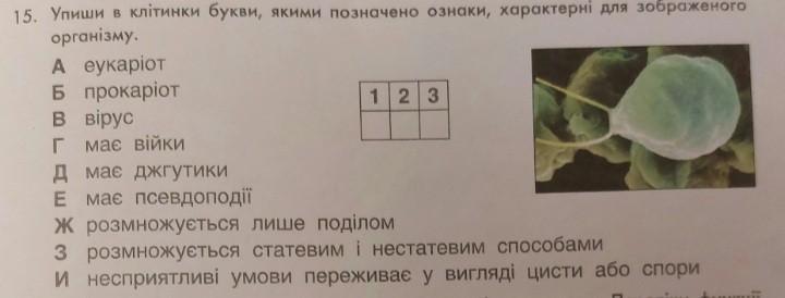 15. Упиши в клітинки букви, якими позначено ознаки, характерні для зображеного організму. A eykapior Б прокаріот в вірус Г має війки д має джгутики Е має псевдоподії 1 2 3 ж розмножується лише поділом 3 розмножується статевим і нестатевим способами И несприятливі умови переживає у вигляді цисти або спосіб життя .Даю 80 баллов и делаю лучший ответ!)