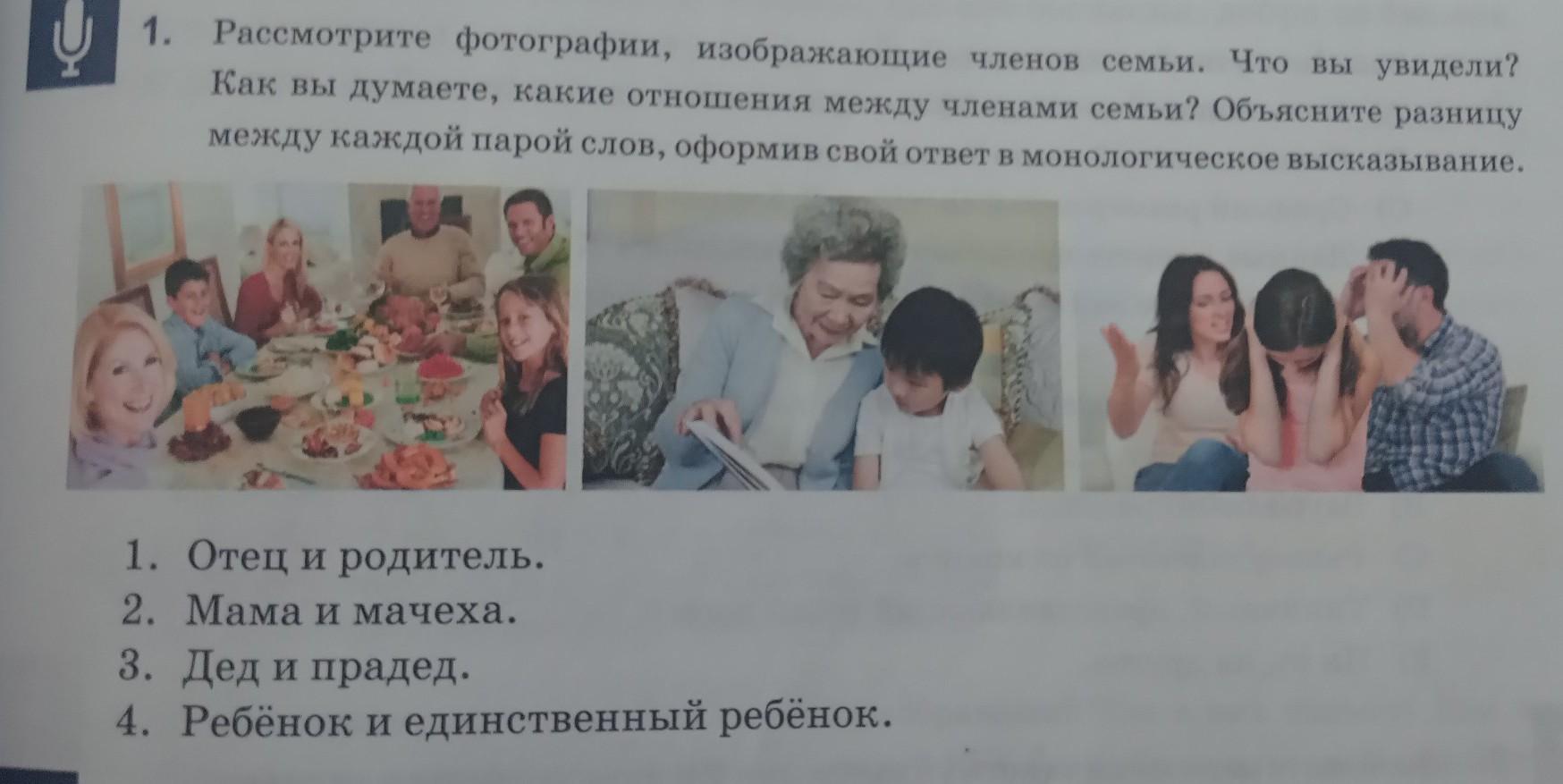 1. Рассмотрите фотографии, изображающие членов семьи. Что вы увидели? Как вы думаете, какие отношения между членами семьи? Объясните разницу между каждой парой слов, оформив свой ответ в монологическое высказывание.
