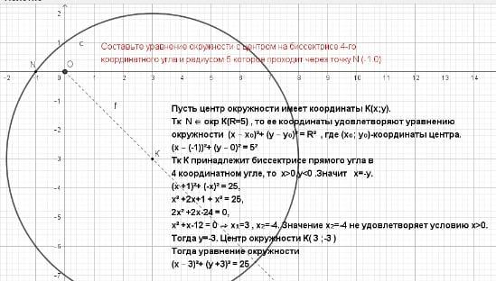 Составьте уравнение окружности с центром на биссектрисе 4-го координатного угла и радиусом 5 которое проходит через точку N (-1.0)