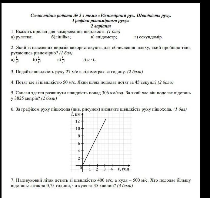 Самостійна робота № 5 з теми «Рівномірний рух. Швидкість руху. Графіки рівномірного руху» 2 варіант СРОЧНО! Даю 65 балів