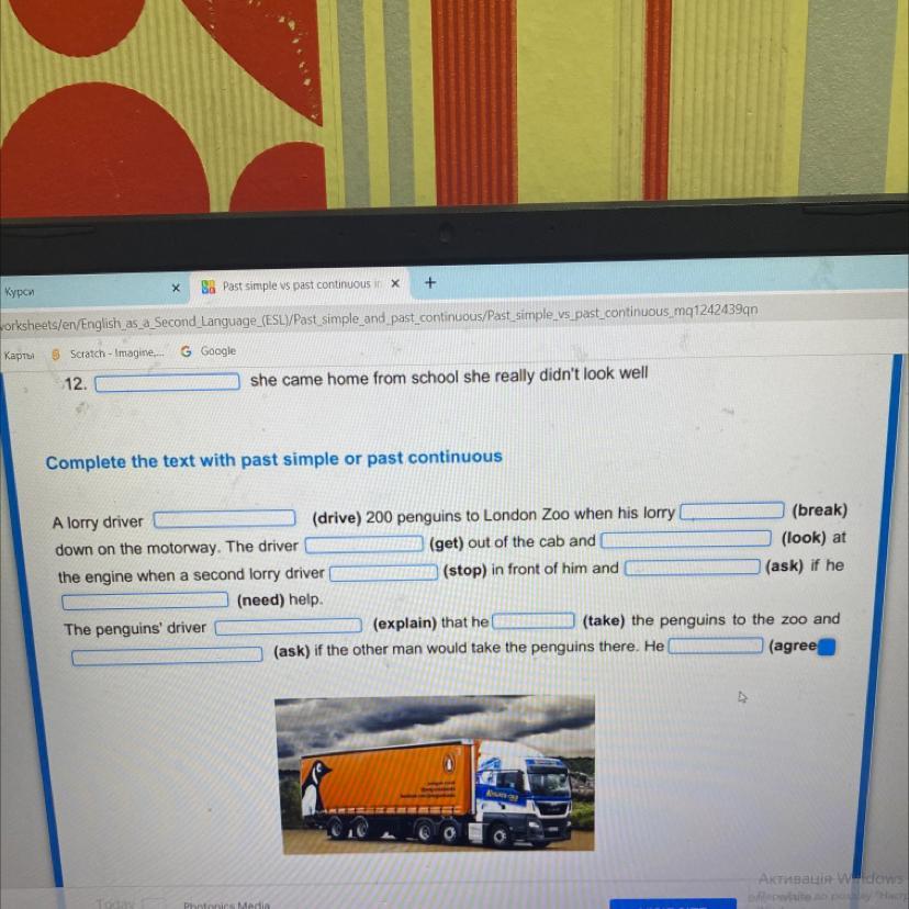 A lorry driver was driving (drive) 200 penguins to London Zoo when his lorry broke (break) down on the motorway. The driver got (get) out of the cab and was looking (look) at the engine when a second lorry driver stopped (stop) in front of him and asked (ask) if he needed (need) help.