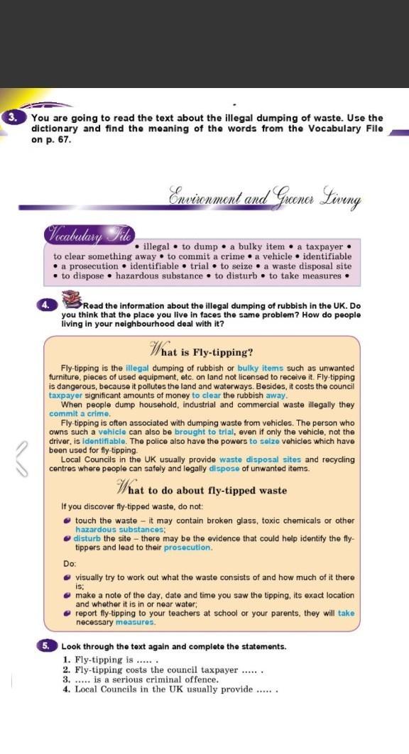5. A) fly-tipping is an illegal way to throw bulky items into illegal places, where you can’t make a dump.