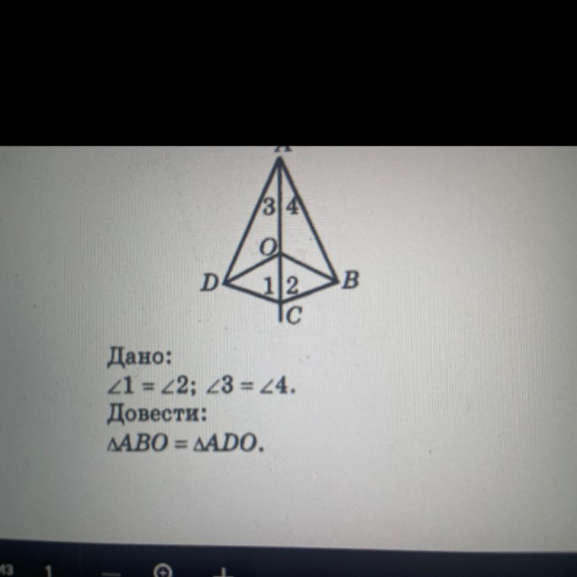 Розглянемо трикутники АВО і АДО. В них АД=АВ, АО - спільна, кут3=кут4. Отже, трикутник АВО= трикутник АДО за першою ознакою рівності трикутників. Що і треба було довести).