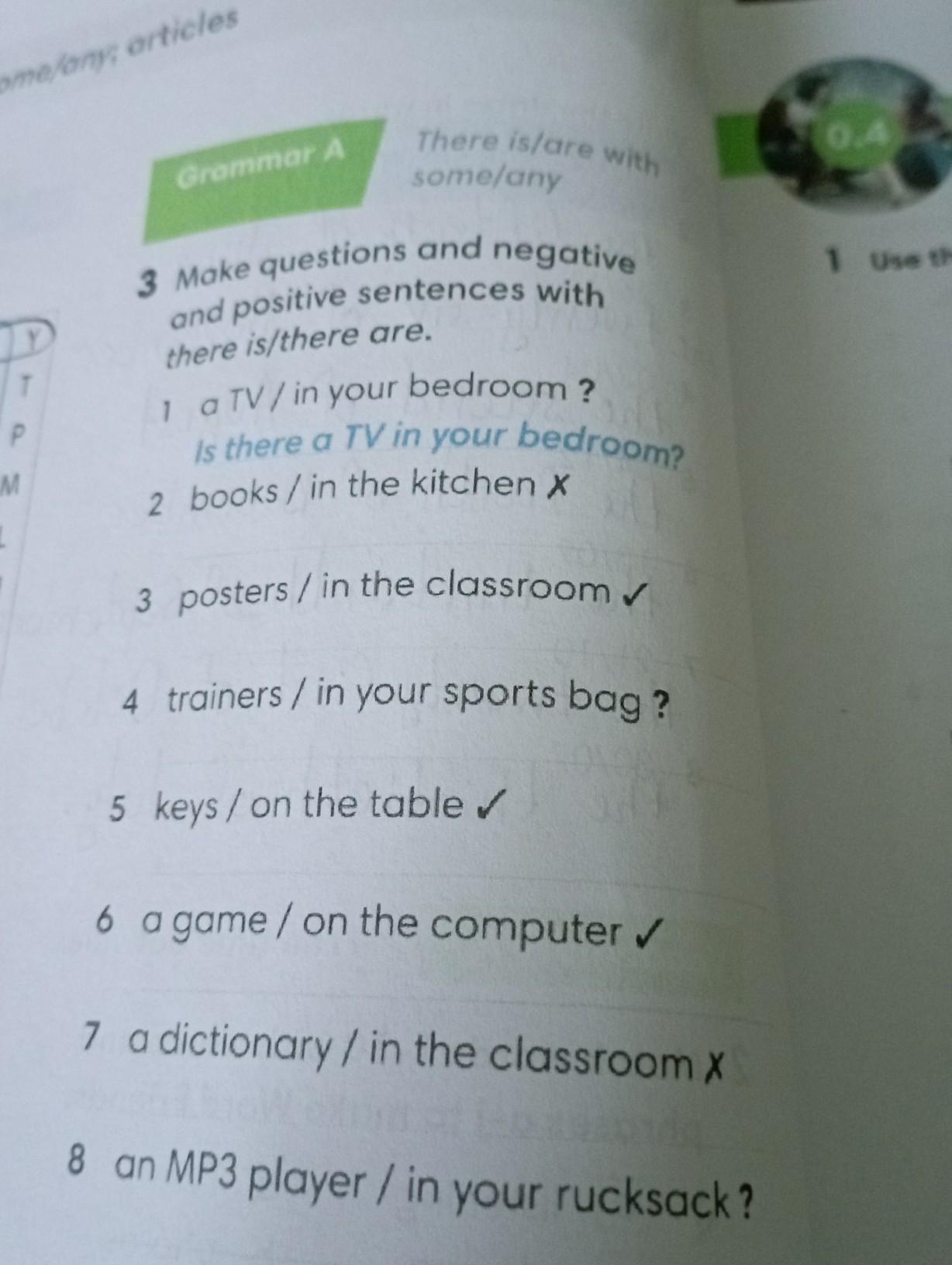 3 Make questions and negative and positive sentences with there is/there are. a TV/ in your bedroom? is there a TV in your bedroom? 2 books / in the kitchen x 1 3 posters / in the classroom ✓ 4 trainers / in your sports bag ? 5 keys / on the table ✓ 6 a game / on the computer ✔ 7 a dictionary / in the classroom x an MP3 player / in your rucksack ?