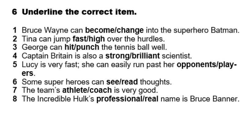 6 Underline the correct item. 1 Bruce Wayne can become/change into the superhero Batman. 2 Tina can jump fast/high over the hurdles. 3 George can hit/punch the tennis ball well. 4 Captain Britain is also a strong/brilliant scientist. 5 Lucy is very fast; she can easily run past her opponents/play- ers. 6 Some super heroes can see/read thoughts. 7 The team's athlete/coach is very good. 8 The Incredible Hulk's professional/real name is Bruce Banner.