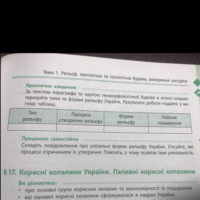 теризуйте типи та форми рельєфу України. Результати роботи подайте у ви-