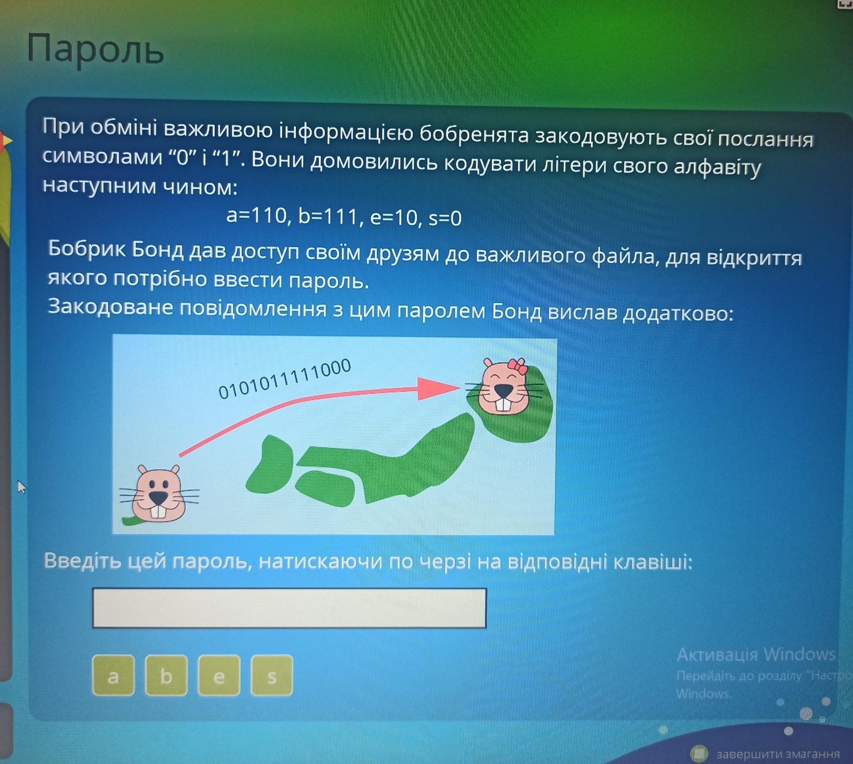 При обміні важливою інформацією бобренята закодовують свої послання символами “0” і “1”. Вони домовились кодувати літери свого алфавіту наступним чином: a=110, b=111, e=10, s=0 Бобрик Бонд дав доступ своїм друзям до важливого файла, для відкриття якого потрібно ввести пароль. Закодоване повідомлення з цим паролем Бонд вислав додатково: 0101011111000 Введіть цей пароль, натискаючи по черзі на відповідні клавіші