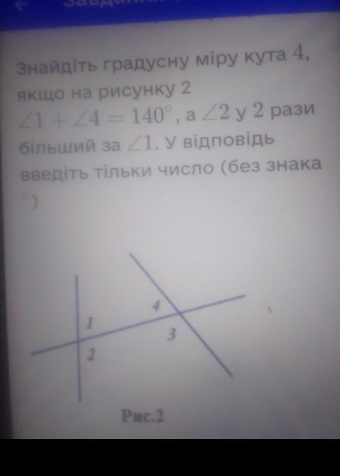 Знайдіть градусну міру кута 4, якщо на рисунку 2 21 + 24 = 140°, а /2 у 2 рази більший за 1. У відповідь введіть тільки число (без знака 9)