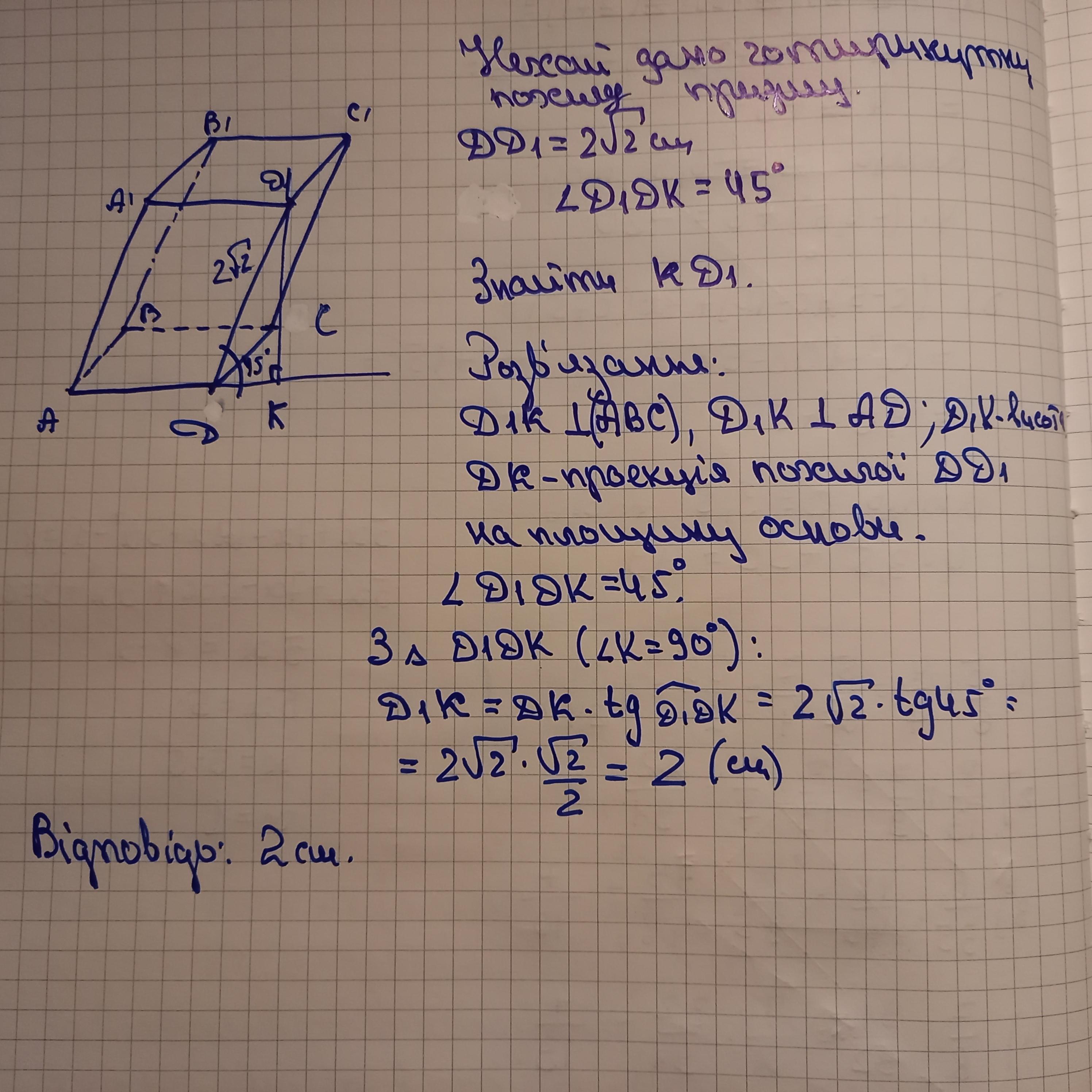 Бічне ребро похилої призми дорівнює 2√2 см і нахилене до площини основи під кутом 45⁰. Знайдіть висоту призми. Плюс нужен рисунок
