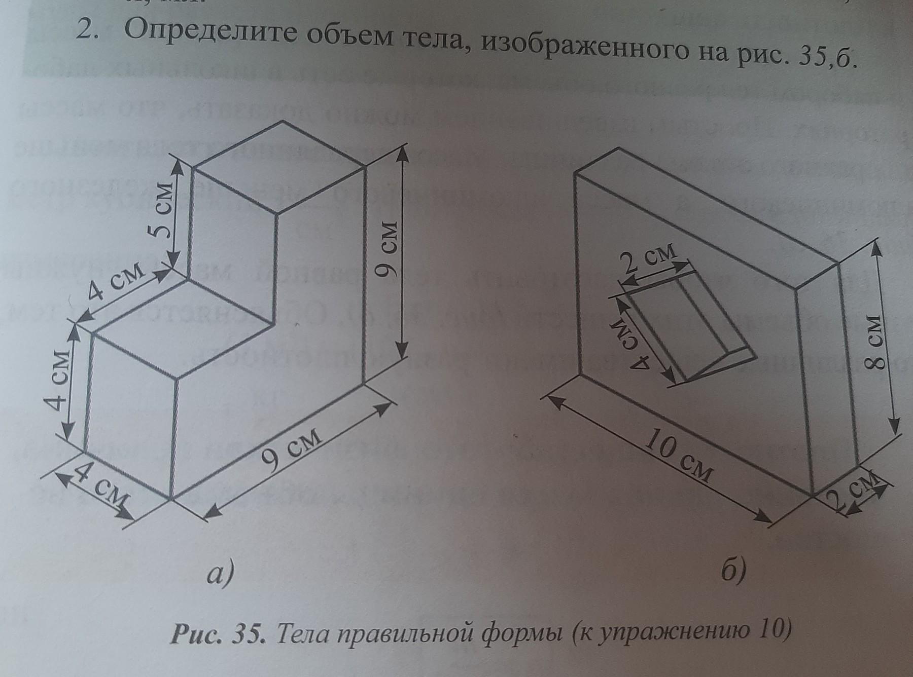 то Упражнение 10д 1. Выразите обьем тела, равный 435 см3, в м3, дм³, мм л, мл. 2. Определите объем тела, изображенного на рис. 35.б. 4 см 4 CM 5 см 74 см, 9 CM 9 см 2 см 4 см 10 см б) a) Рис. 35. Тела правильной формы (к упражнению 10) 8 см CM