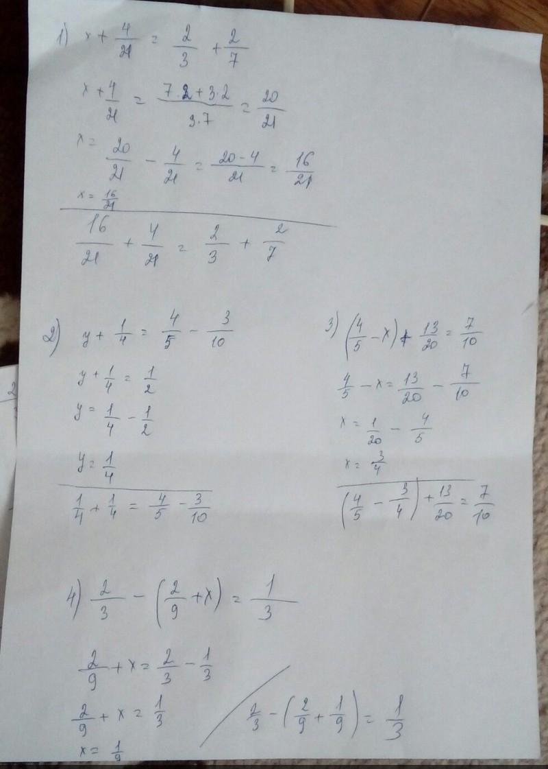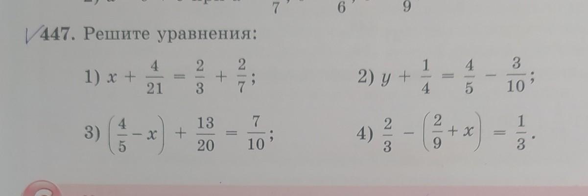 /447. Решите уравнения: 2 3 1) x + 3) 4 5 4 21 x + + 13 20 2 7 10 2) y + 4) 2 2 3 4 2 9 4 5 + x 3 10 1 3