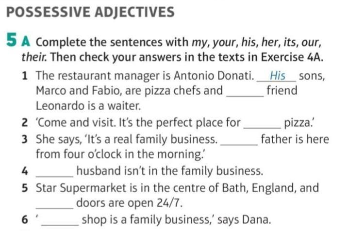 POSSESSIVE ADJECTIVES 5 A Complete the sentences with my, your, his, her, its, our, their. Then check your answers in the texts in Exercise 4A. 1 The restaurant manager is Antonio Donati. sons, Marco and Fabio, are pizza chefs and Leonardo is a waiter. 2 'Come and visit. It's the perfect place for 3 She says, 'It's a real family business. from four o'clock in the morning! His friend 6 pizza. father is here 4 husband isn't in the family business. 5 Star Supermarket is in the centre of Bath, England, and doors are open 24/7. shop is a family business,' says Dana.