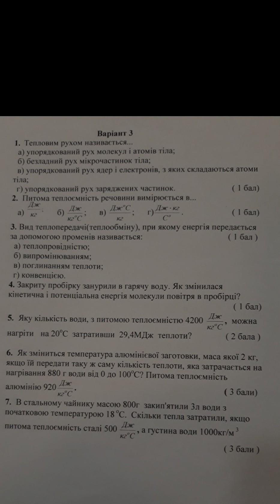 Варіант 3 1. Тепловим рухом називається... а) упорядкований рух молекул і атомів тіла б) безладний рух мікрочастинок тіла; в) упорядкований рух ядер і електронів, з яких складаються атоми тіла; (1 бал) г) упорядкований рух заряджених частинок. 2. Питома теплоємність речовини вимірюється в... Дж Дж Дж°С. Дж. кг a) B) Г)- (1 бал) K2 К2 Со 3. Вид теплопередачі(теплообміну), при якому енергія передається за допомогою променів називається: ( 1 бал) а) теплопровідністю; б) випромінюванням; в) поглинанням теплоти; г) конвенцією. 6) кг С 4. Закриту пробірку занурили в гарячу воду. Як змінилася кінетична і потенціальна енергія молекули повітря в пробiрцi? (1 бал) 5. Яку кількість води, з питомою теплоємністю 4200 нагріти на 20°С затративши 29,4МДж теплоти? Дж 9 K2° можна (2 бала) 6. Як зміниться температура алюмінієвої заготовки, маса якої 2 кг, якщо їй передати таку ж саму кількість теплоти, яка затрачається на нагрівання 880 г води від 0 до 100°С? Питома теплоємність алюмінію 920 Дж кг°C' ( 3 бали) 7. В стальному чайнику масою 800г закип'ятили 3 води з початковою температурою 18°С. Скільки тепла затратили, якщо питома теплоємність сталі 500 Дж а густина води 1000кг/м 3 кг°C ( 3 бали )