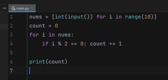 Написать код в Python. Определить количество чётных чисел из десяти чисел введеных пользователем