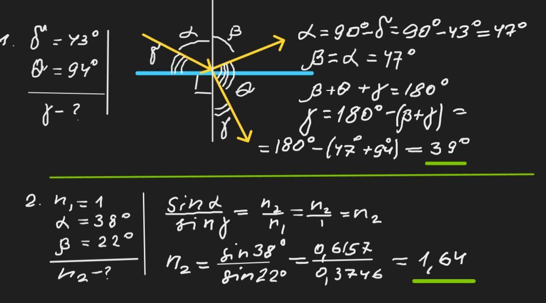 1) Кут між падаючим променем і поверхнею дорівнює 43⁰, а кут між відбитим променем і заломленим - 94⁰. Знайдіть кут заломлення променя.
