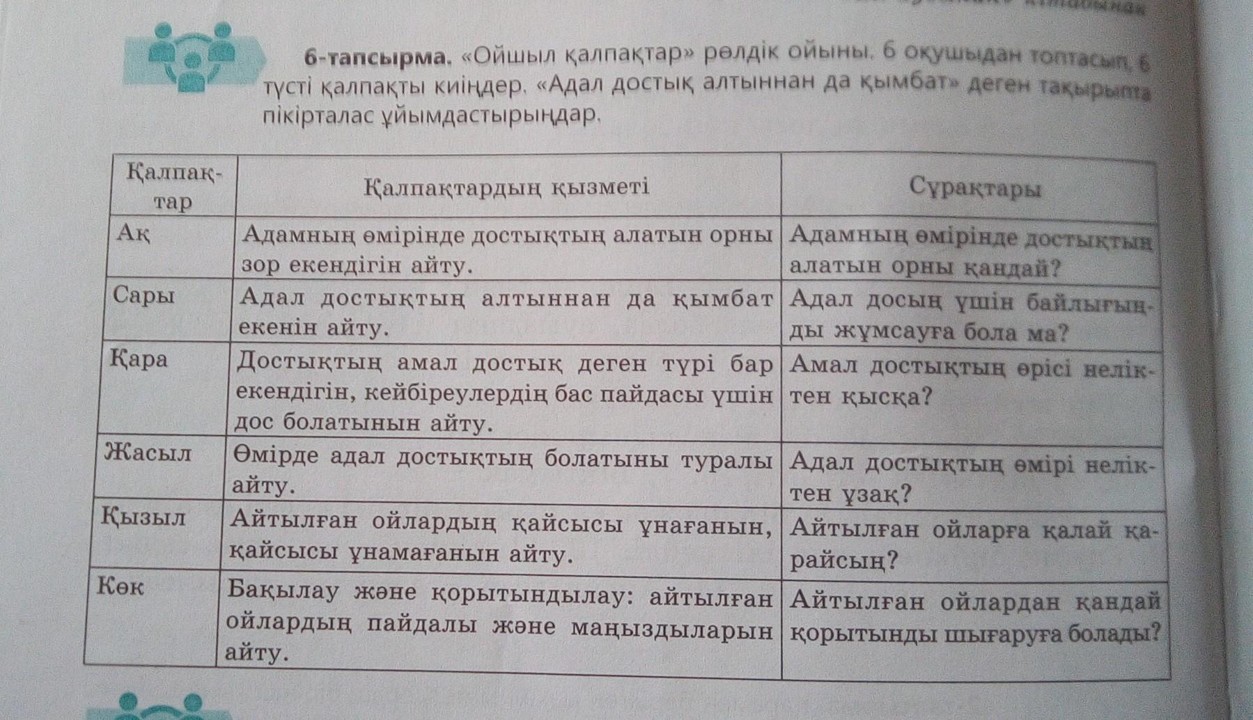 6)Айтылған ойлардан, достыққа адал болу қажет, саған сеніп, саған сыйластық көрсеткен адамда сыйластық көрсетіп, сенімін жерге тастамау керек. Достық атын малданып жүргендерге алданып қалмау керек.