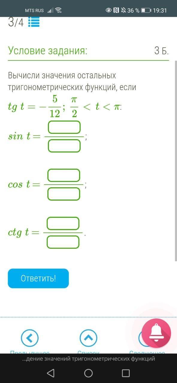 1 + tg²t = 1/cos²t ⇒ tg²t = 1/cos²t - 1 = 625/576 - 1 = 49/576 ,