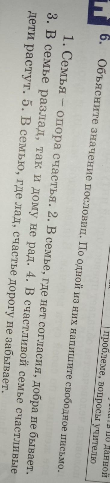 6. Объясните значение пословиц. По одной из них напишите свободное письмо 1. Семья - опора счастья. 2. В семье, где нет согласия, добра не бывае 3. В семье разлад, так и дому не рад. 4. В счастливой семье счастливы дети растут. 5. В семью, где лад, счастье дорогу не забывает.