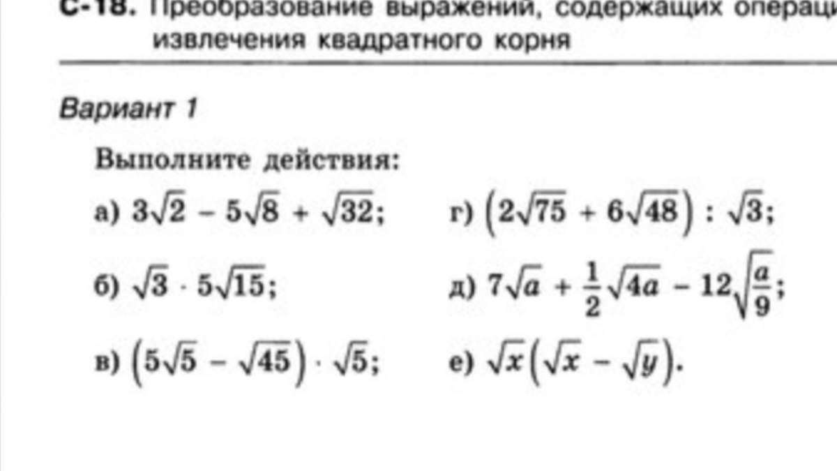 г) (2корень75 + 6корень48):корень3 = (10корень3 + 24корень3):корень3 = 34корень3